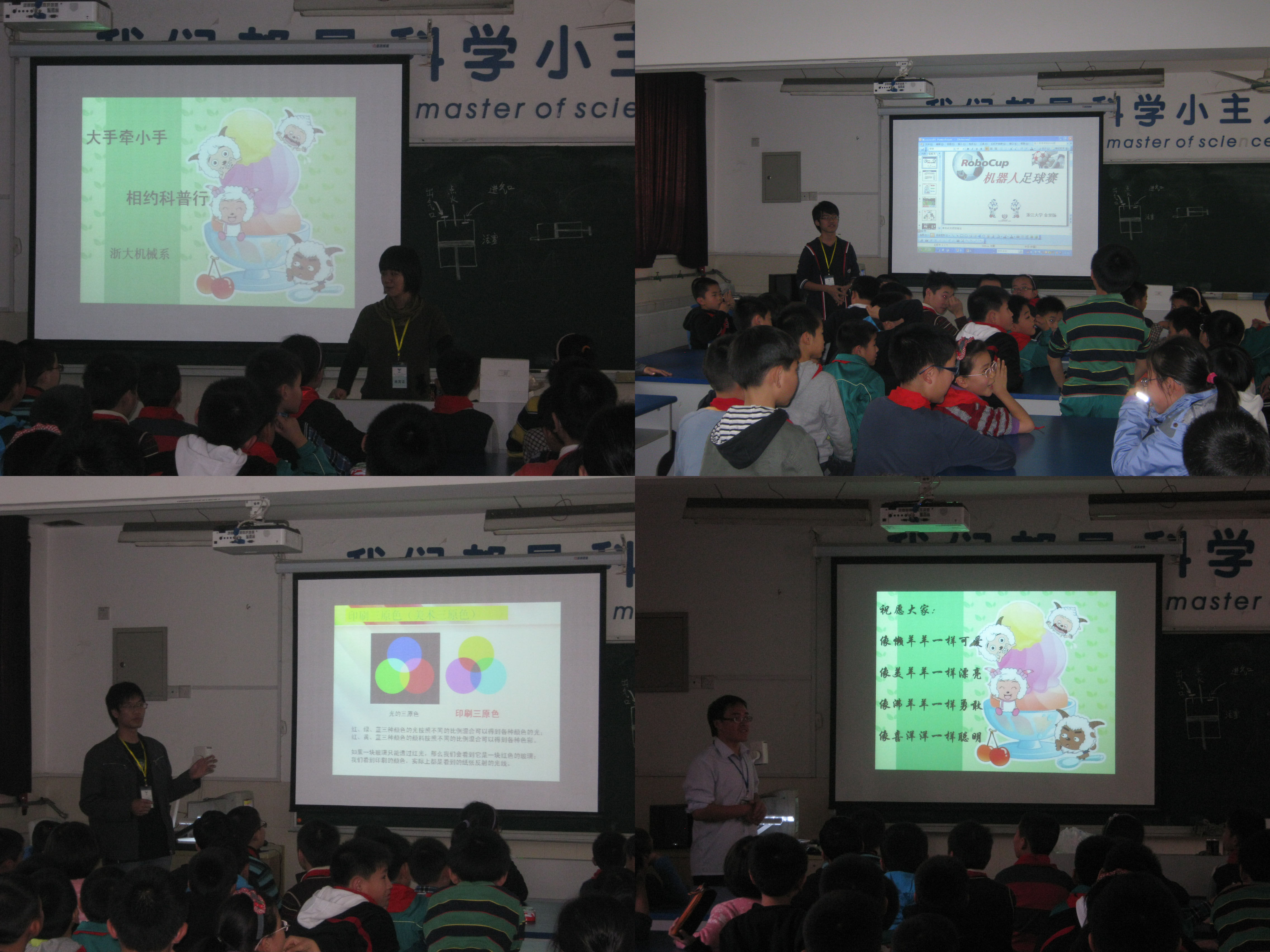 2011年11月29日下午,在浙大附小教务处的赵老师的带领下,我们一行四人来到了小学生们的科学教室,开始准备我们科普行的第一堂课。2点钟,来上课的同学们蜂拥而至,争先抢占前面的位置,小朋友们渴望知识的眼神深深地鼓舞了我们。