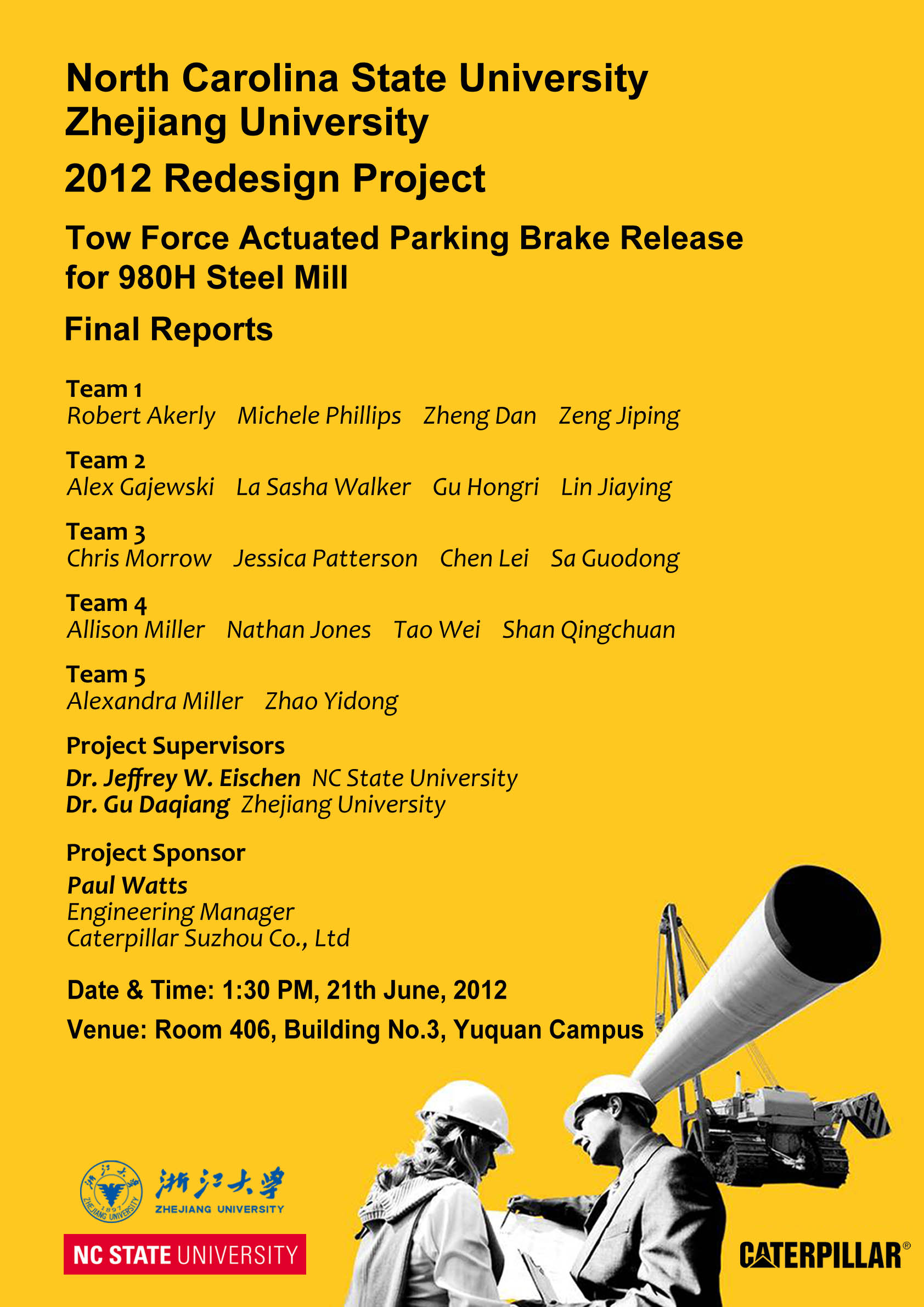 今年是ZJU-NCSU机械设计课程合作项目开展的第三年。历年学生设计结果均获得卡特彼勒公司的好评。
