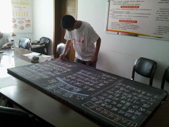 在接下来的三天,社区主任安排给我们的任务是为目前进行的分类垃圾和暑期健康活动出几份黑板报。黑板报数量不少,在空闲时间,我们上网查阅有关资料以及黑板报样式,我们几个人分工明确、团结一致,发挥各自的特长,经过团体队员的努力,我们将黑板报设计地有声有色,在最后工作人员验收时得到满意的称赞。我们都感觉到自己虽是工科男,工作中却需要综合素质的体现。