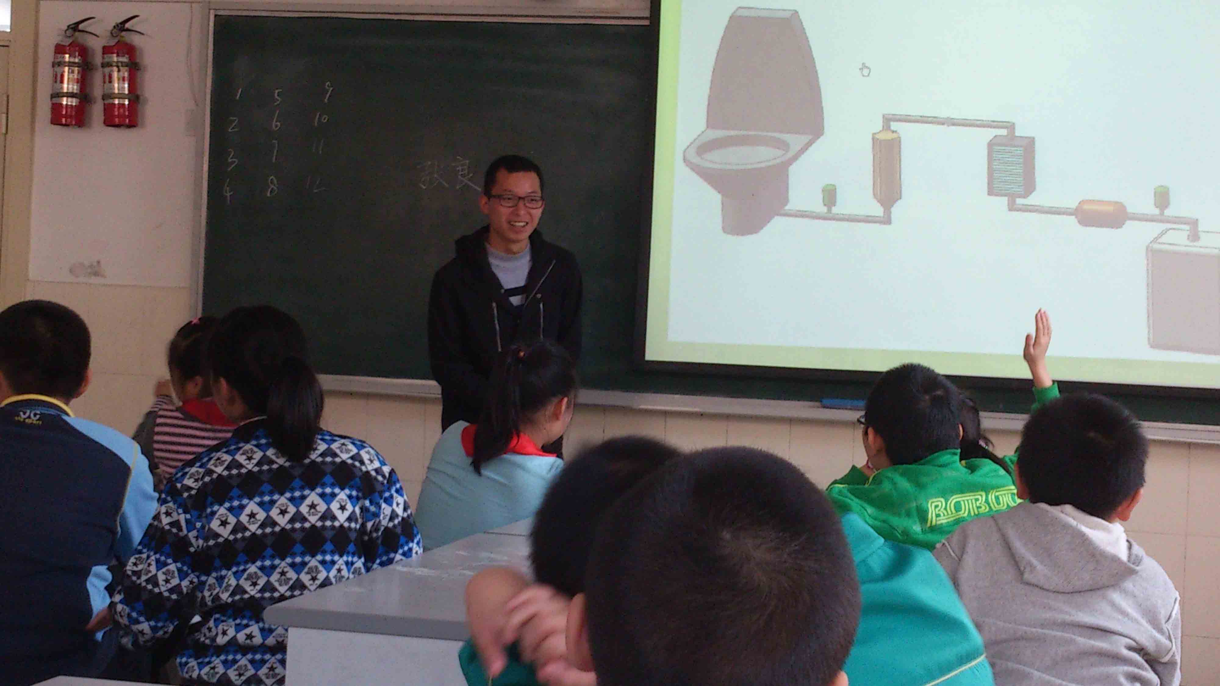 机自0903班的张良同学讲解的主题是“尿液化甘泉——航天科技让天更蓝水更甜”。他用浅显易懂的语言讲解美国航天局如何利用高科技的力量把航天员的尿液转变成饮用水,一讲到关键技术,整个教室就安静下来,唯恐漏过一丁点有意思的知识。小朋友们还积极回答“老师”提出的小问题,也不断举手提问。对孩子们提的问题,虽然我们有充足的准备,可偶尔还是被问倒了,心中阵阵惭愧,同时赞叹孩子们的智慧无限,思域无穷。