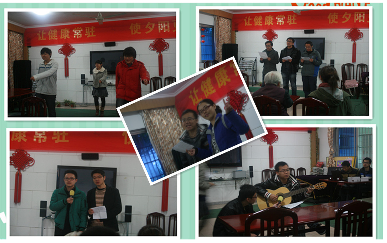 第一个节目是红会的三个志愿者张翮、包敏燕、卢冰倩为老人们带来的广播操表演,阳光活力的表演让老人们感受到了年轻人的青春和活力。随后越剧社的张蕾带来了她准备的越剧——月照西厢,用柔美动听的声音带我们走进了越剧的世界。第三个节目是我班三个同学游立锦、魏宏远、陈仁康带来的深情饱满的诗朗诵。欣赏了诗朗诵后,我班的金挺和徐立晖为老人们带来了一首《我爱你中国》,深情的唱着我们年轻一代对祖国无比的热爱。紧随其后,卢冰倩和樊亚容表演了几个小魔术,老人们目不转睛的看着,生怕错过了什么细节,在两位同学成功表演后,都报以了热烈的掌声。在神奇的魔术表演后,陶钧冶、赵勇以及我班的武敏、于昂可带来了街舞和时下流行的《江南style》舞蹈,伴随着动感的节奏,带来了一段青春活力的表演。在动感的舞蹈后,我班的荆帅同学献上了吉他弹唱《小城故事》,柔和优美的旋律配着深情的演唱,带着我们走进了那温暖的小城故事。倾听了小城故事后,高鹏等几位同学带来了双节棍表演,那快速飞舞的双节棍,让我们看得眼花缭乱,让人忍不住为他们喝彩。刺激的双节棍表演后,我班的于昂可和荆帅两位同学对唱了一首经典黄梅戏,为老人们带来了欢乐。最后,全体同学来了一首合唱《歌唱祖国》,台下的老人们也情不自禁地轻轻和着,此时此刻,激昂的歌声似乎也变得柔情似水。