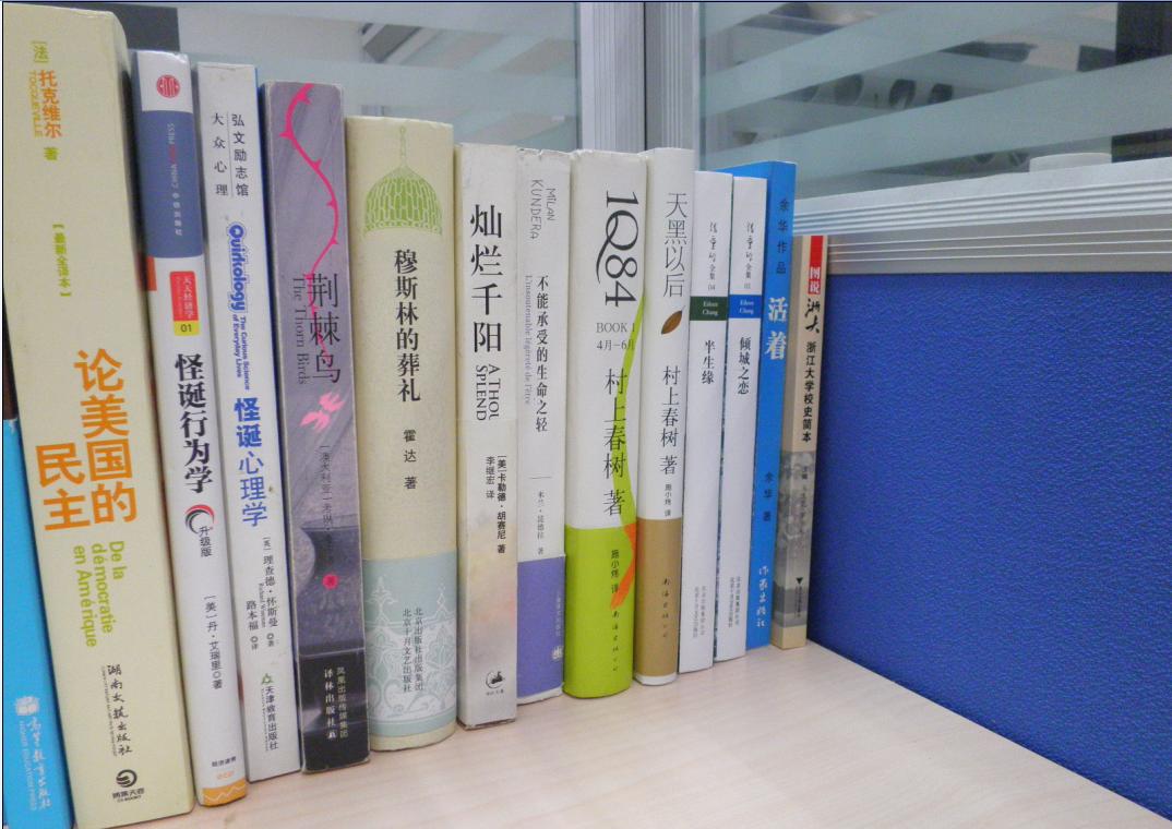 书库虽小,但五脏俱全。小书库目前共有42本藏书,皆由班级同学们自发提供,包括散文、小说、哲学、心理学等诸多门类,这些书籍多是一些比较经典的书籍,或名著,或指导性书籍,满足同学的不同需求。闲暇之余,适当的读一些人文社科类书籍,提高了人文素养的同时陶冶了情操,也能给沉闷的科研生活添加一些不一样的色彩。