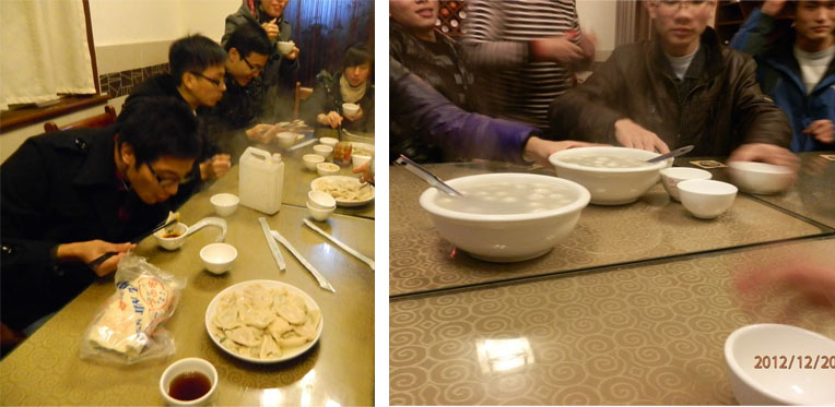 一年一度冬至到,是缘分让机电12硕2班的兄弟姐妹能相聚在浙大欢度佳节,为了让同学们感受到家的气息,大家纷纷响应要聚在一起包饺子来共同度过这个难忘的日子。2012年12月19日下午4点,机电12硕2班的同学们齐聚在南门外的东北菜馆,在欢声笑语中,大家提前感受了冬至佳节家一般的温暖。