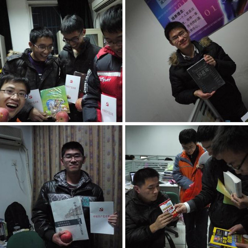 为了让大家过一个快乐的圣诞和元旦,可忙坏了咱们的书记和班长。早在离节日当天还有一个多星期的时候,几个人就商讨着要给大家送上什么样的惊喜。最后经过讨论,决定送大家每人一个苹果和一本书做为圣诞礼物。红红的苹果寓意平平安安,是祝愿大家能够在以后的日子里身体健康,一切顺利;精美的书籍则是知识海洋的代表,是希望大家能够驰骋学海,多读书、多学习,用知识充实自己。