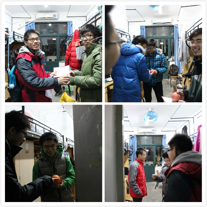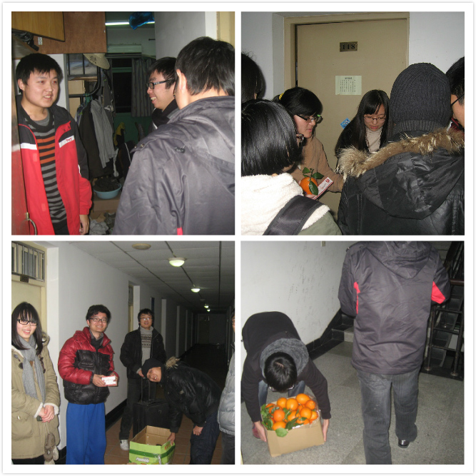 紫金港校区的礼物分发活动定在1月4日这天,巧逢千年难遇的2013.1.4这样吉利的日子。连续两天的大雪也为校园里增添了一抹别样的风采。当天傍晚,团学联的几十位同学放弃了晚饭的时间,分为4组对蓝田的机械系同学和“新生之友”对口同学送上了我们的新年祝福和精心准备的礼物,并且细致地诠释了“送货上门”这个词的精髓。通过新年送“橙意”这一活动既可以送上我们的新年祝福也能够增强紫金港11级同学的机械系大家庭归属感。12级“新生之友”同学收到的则是苹果,“平安果”送去的是机械系大家庭对他们的祝福,希望他们大学四年都能够平平安安,开心顺利。收到礼物的同学看着写满祝福的贺卡,握着又大又圆的橙子或苹果,仿佛感受到了家的温暖。他们也对机械系各位老师的关怀以及团学联工作人员表示了感谢,并以自己的方式为机械系送上了自己的祝福,祝愿机械系越来越好。