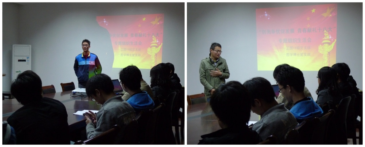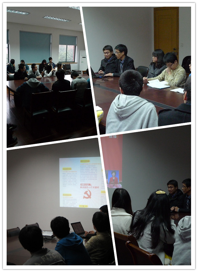 在十八大会议刚结束时,我支部就联合图学所博士党支部共同召开了十八大专题组织生活会。首先,博士党支部副书记颊维强对这次主题活动的安排进行了简短的介绍。接着由工图11硕党支部副书记秦信伟用PPT的方式,与我们一同学习十八大的内容与精神。他主要讲解了十八大的三个重要事件:十八大报告、修改党章和领导层换届。十八大报告部分,他给大家播放了一段胡锦涛总书记做报告的视频,然后重点解读了十八大报告的十个关键词,包括不走老路和邪路、宪法内活动、维护中央权威、政治体制改革、科学发展观、GDP翻一番、反腐倡廉、军队信息化、不称霸不扩张和持续两岸交流等。可以说,全方位地解读了十八大报告,使党员同志对十八大报告有了很清晰的认识。关于党章的修改和领导层换届,秦信伟副书记也做了简明扼要的讲解。讲解最后,集体观看了我党新任总书记习近平同志的记者见面会演讲,感受到了习总书记平易近人,不做作的作风。学习期间同学们态度认真,并积极记录下自己所得的感想。