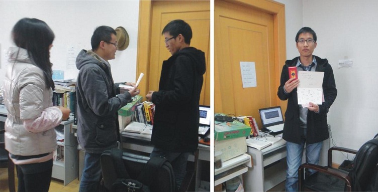 在我本命年的生日当天,幽默风趣的班长和美丽大方的团支书代表班级送来了生日贺卡和礼物,这让我感到很幸福、温暖和感动。生日贺卡很精致,上面写满了班级兄弟姐妹们的签名和祝福;小礼物也很精美,浙大纪念版的铜制书签,让人爱不释手。贺卡和礼物我会一直珍藏着的,太爱你们了,工图11硕的兄弟姐妹们! ——秦信伟