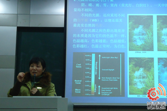 讲座中,翁卫洲老师由浅入深地为大家讲解了单反相机的基本知识及摄影技巧。她首先给大家介绍了摄影镜头的分类,这让大家对摄影镜头有了一个新的认识,可以在今后的摄影中根据不同情景选用相对应的镜头。接着,她从光圈大小、快门速度、曝光量这些摄影专业词汇入手,告诉大家他们的具体含义和调节方法。翁老师强调,如果只会使用相机的“AUTO”挡和“P” 挡,那就完全浪费了单反相机带给我们的美,只有在不同的天气、光线和景物拍摄中选择不同的拍摄模式,才能拍摄出美的照片。在座的老师和同学都听得十分认真,并及时记下自己认为重要的摄影知识,在翁老师的讲解之后,大家似乎都感觉自己在摄影技术方面有那么些“专业”了。