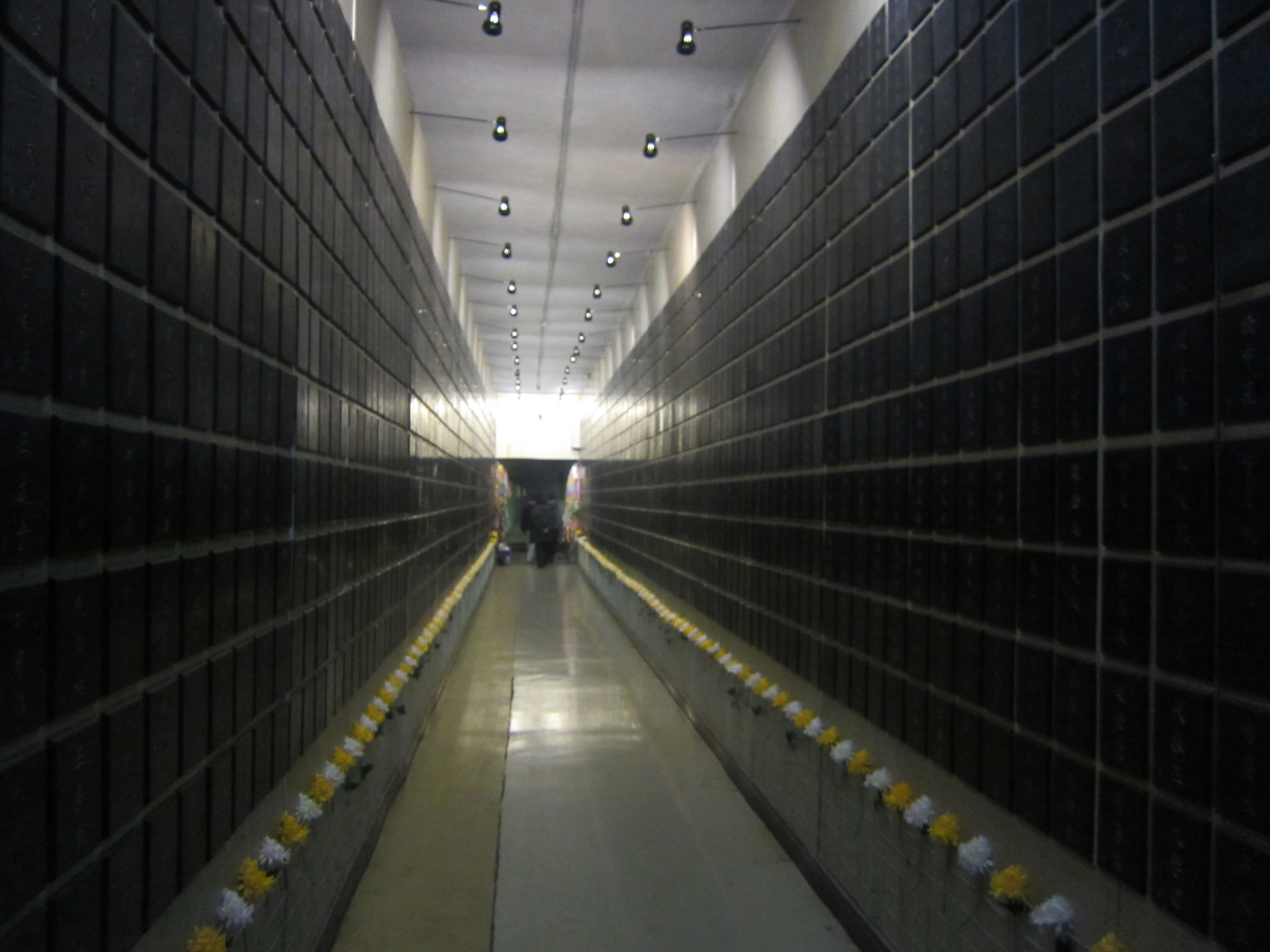 刻有所有受害者姓名的黑色铭牌整齐排列于一条过道两侧,而过道正通向出口——我们从灾难中走过,迎来的是胜利和光明。