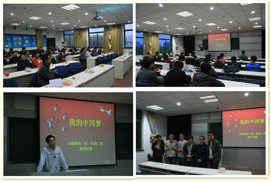 伟大复兴的中国梦,我的梦想我追逐!为了响应机械系开展“青春•使命•中国梦”主题活动的号召,机制12级硕1班和2班的团支部精心策划、开展了系列活动“重怀梦想,飞扬青春”之“重怀梦想”系列活动。主要包含三项内容项:1,“我的中国梦”演讲比赛,同学们畅谈了自己的中国梦;2,观看了两会视频,学习了两会精神;3,观看了梦想励志电影——“逆光飞翔”。
