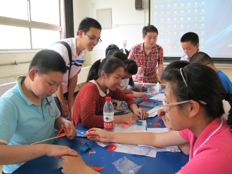 讲解后,志愿者们就两三个分为一组,和小朋友们围成一桌,开始动起手来。小学生们表现活跃,志愿者们也很积极,整个教室顿时热闹起来。