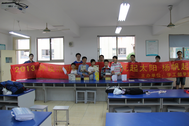 2013年5月14日这天,机械系助学奖学金的获得者带着原材料来到浙大附小,给浙大附小的学生讲解风动力小车的原理,帮助他们设计并制作风动力小车,培养他们的创新意识和动手能力。