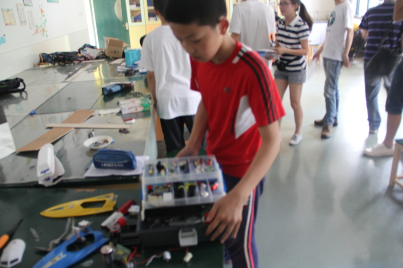 本次志愿者指导的重头戏是可乐瓶电动直线船,这个项目主要是使用规定的饮料瓶为船体,使用电机驱动,进行赛跑。传动轴、轴套、螺丝、粘结材料、电池盒,电线、开关、螺旋桨等这些小朋友们不常见的材料骑上马,构建漂亮的船模。小朋友们为了制作出理想的船模,各种奇思妙想都被提了出来。可是在实际操作中才发现,船模不仅要有足够的动力,还要尽量减小阻力,电机放水、船体密封等都是不得不考虑的因素,这些都是考验小朋友智慧的时刻。只见一个小朋友在一边抓耳挠腮,突然眼睛一亮,提出了将螺旋桨悬置在半空,利用风动力推动船体的方案,经过大家的实验,这个方案让小船一下子增速不少,并取得了很好的效果。
