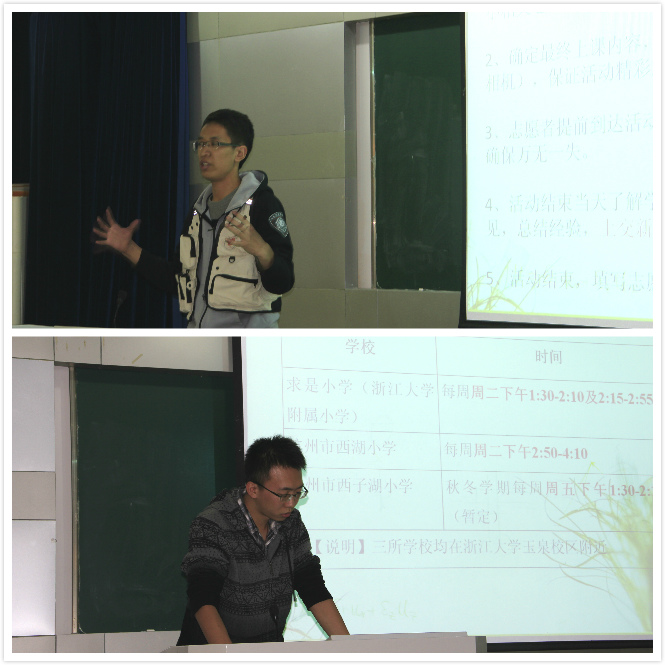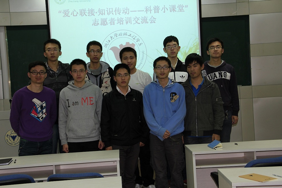 会议开始,团学联实践部部长冯嘉炜介绍了这次志愿者活动的前期准备情况。“科普小课堂”活动本着“奉献,友爱,互助,进步”的志愿者奉献精神,以展现我系机械学子积极投身志愿服务活动的奉献精神,由团学联实践部认真策划、组织。志愿者将在浙江大学附属小学(求是小学),杭州西湖小学,杭州西子湖小学三个志愿服务基地开展科普活动。