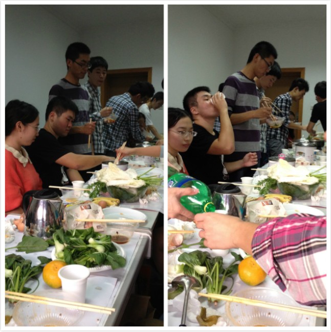 随着班长一声“动手吧”,大家才意犹未尽的从“各抒己见”中全身而退出来。接下来考验的是大伙的动手能力、团结协调能力,新晋出炉的班委们给大家买来了各式各样的新鲜蔬菜和肉类食品,也准备了各类厨具,主要是为了满足大家“自己动手,丰衣足食”的强烈愿望。大家一起洗盘子、洗菜、擦桌子、扫地……,忙的不亦乐乎。