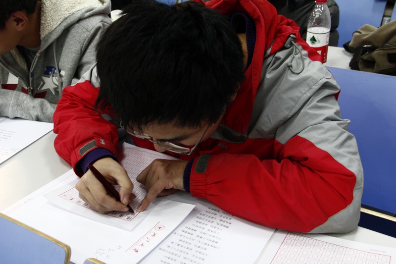 许多参赛同学早早到达教室练习书法。下午两点半,大赛正式开始,负责人王鹏同学向大家简要介绍了大赛举行的意义及比赛规则。由于平时学习的需要以及笔记本电脑、ipad等所提供的便利,如今的大学生越来越依赖于这些电子设备而渐渐疏于对于书法的练习。本次硬笔书法大赛旨将大家从敲打键盘的简单粗暴中解放出来,回归一笔一划写字的熟悉感觉。
