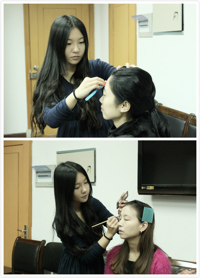 上午九点半,很多同学还没有摆脱睡意,潘老师已经到达培训地点-玉泉校区教一411。在这次培训中,潘老师着重讲解了化妆的一些高级技巧。12月1日,潘老师为礼仪队的女孩儿们示范了一个甜美的妆容,同学们都记忆犹新,本就清秀的章寰同学在老师一番精心装扮下变得格外娇媚动人。女孩儿们都很希望自己也能充当模特,被潘老师的巧手修饰一番,13机电硕士班的周燕飞同学幸运地成为这次的模特。这次要示范的是一款华丽而又神秘的妆容,在为周燕飞同学化妆的过程中,潘老师细致地讲解了每个步骤的方法和技巧。在讲到难点时,同学们都围过来仔细观察老师的手法,不想错过一点内容。