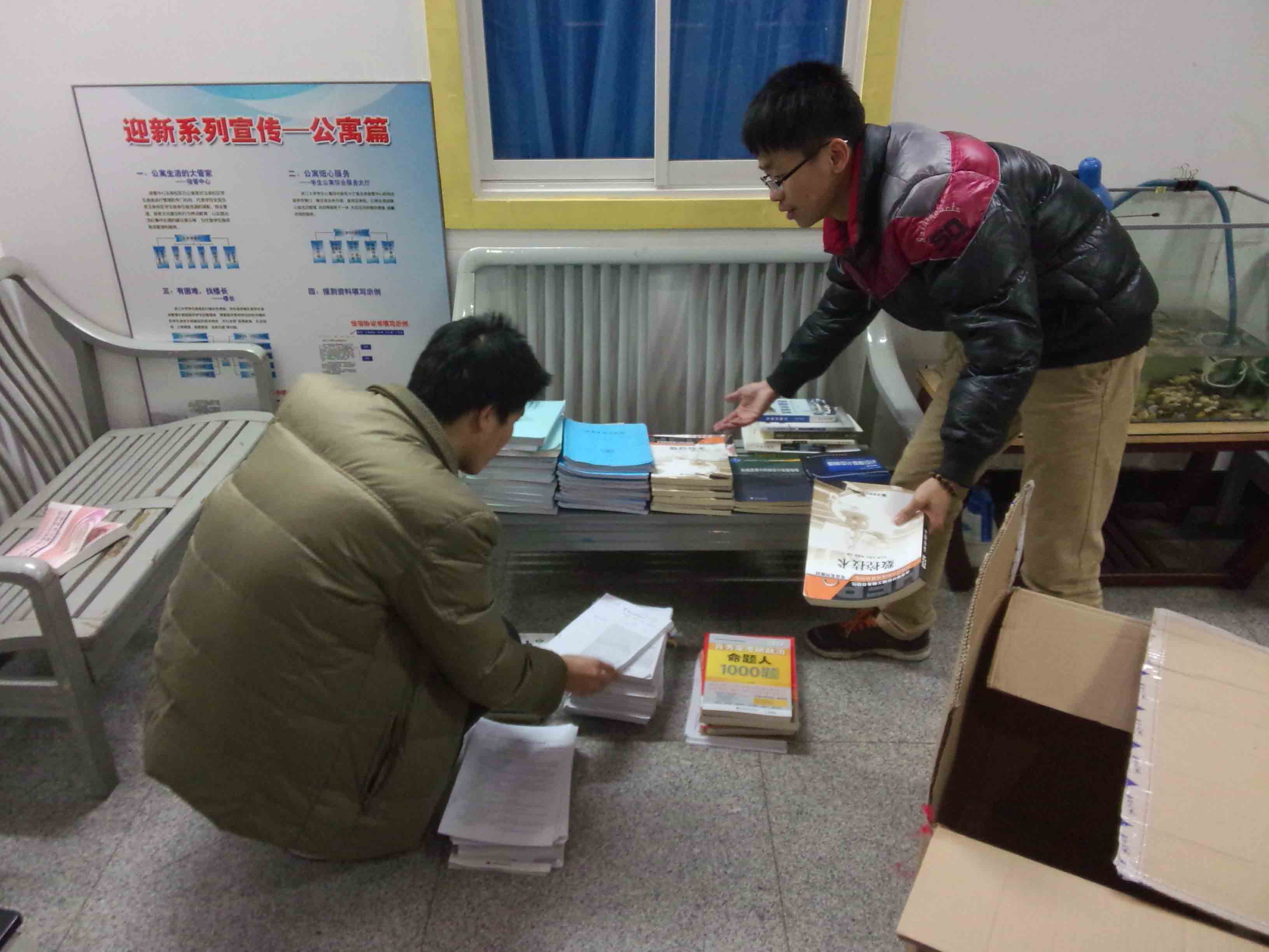 晚上8点的时候,活动的工作人员将书本都搬到了30舍一楼,与11级的党员同志郑多文和张师朋一起将书本分类整理,最后装箱,用自行车载到7舍(11级同学的住处)。