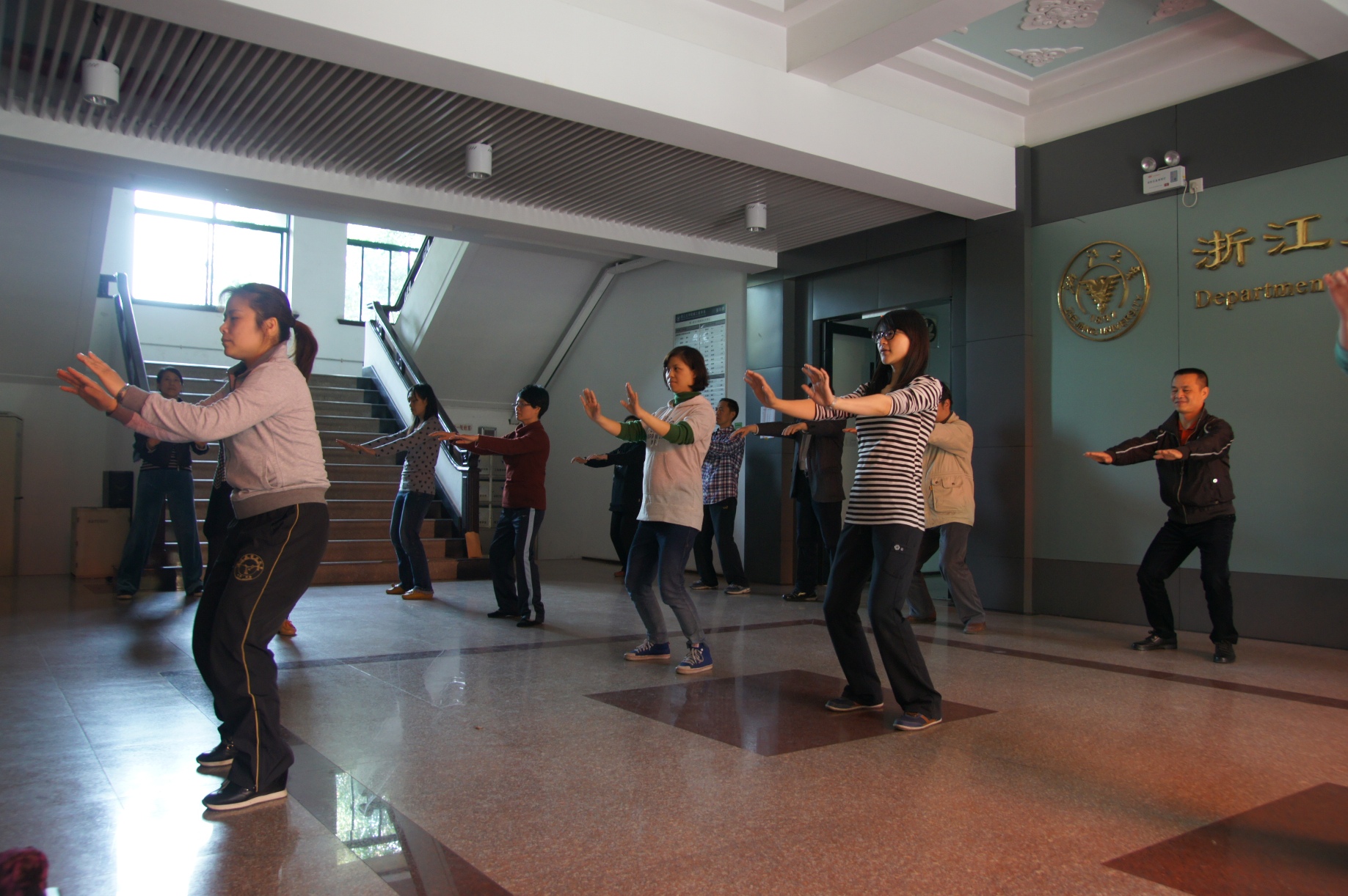 启动会上,王晓莹书记先为大家介绍了系工会开展系列活动的情况和意义,并号召大家积极锻炼,拥有健康的身心。董晓虹教授与大家分享了体育的促进作用和锻炼的乐趣,介绍了本次培训活动的教练。本次培训活动邀请了体育系徐曼老师担任教练。徐老师是武术高级教练,担任教练期间,所带队员累计获得浙江省青少年武术比赛金牌近150枚,曾四次受到杭州市政府嘉奖,并被评为杭州市优秀教练员。在大家的掌声中,徐教练为大家介绍了太极拳的基本套路和本次培训的时间安排、学习进程等,让大家有了基本的了解。