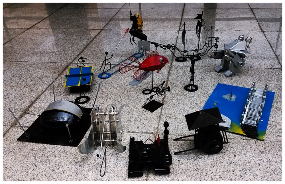 4月12日,为期两天的实物制作环节正式开始。依照最终的草图,同学们使用常见的小零件,通过切割、焊接等加工手段,将简单的图案一步步变成精美的作品。同学们的创意丰富多彩,例如第五组作品“守护和平”多处运用螺母,或作士兵的头盔,或作大炮的炮口,一物多用,巧妙不凡;第六组作品“缘定浙大”用铁丝拧出了桥上的一对紧紧依偎的情侣和水中的一对曲项交首的天鹅,交相辉映、活灵活现,气氛浪漫至极;第十二组作品“海盗船”则凭借简单的黑色线条,勾勒出了复杂的船型轮廓,画着白色骷髅头的帆布、坠在船尾的铁锚,匠心独运,让人赞叹不已。