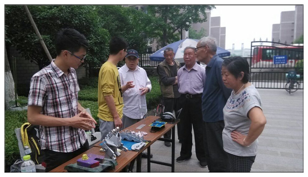 同学们一早便来到了港湾家园,午后工作站点已初具雏形。社区的居民们来来往往,不经意地被摊位上的展品吸引。好奇的居民们三两成群,围在展览台询问作品的来由,志愿者们介绍道,“这些作品都是机械动漫节参赛队伍自行设计,在学校的金工实习中心亲手制作出来的。”一位满头白发的老爷爷听到后忍不住称赞:“现在的孩子真聪明,有想法,又肯动手,不错!”