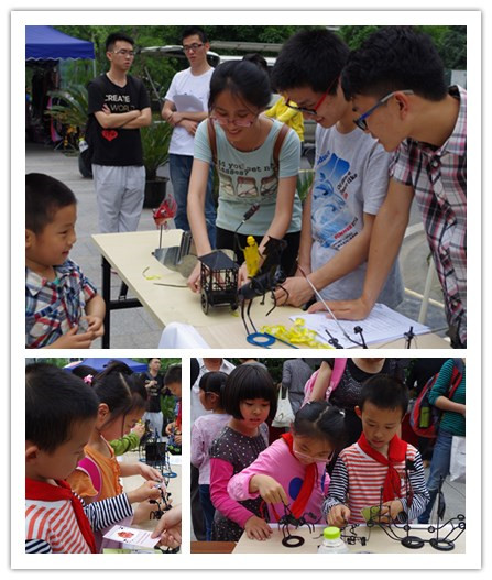 下午15:00是活动的高峰期,放学回来的小朋友们一看到形态逼真的模型便一拥而上,兴奋地摆弄着作品。小朋友们兴奋地推推小坦克、转转机器人、摸摸海盗船,志愿者们则寓教于乐地向小朋友们介绍构思设计、制作加工的方式方法,同时普及机械的基础工艺。最后,志愿者们向小朋友们赠送了自己设计制作的书签,真诚地希望小朋友们能勤劳动手、学好知识。