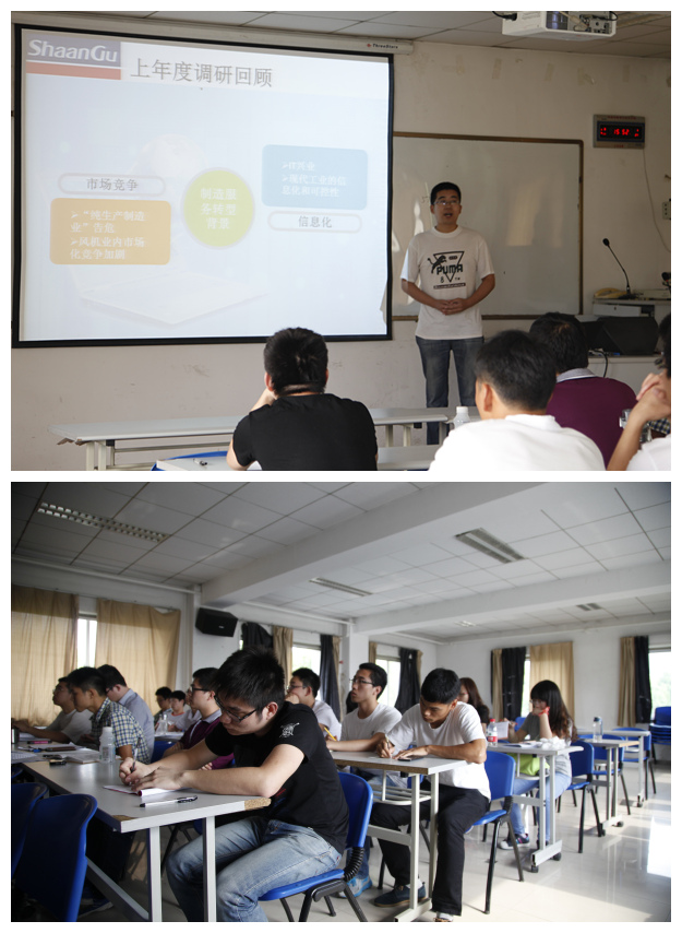 随后,团队成员按照事先分好的三个小组进行汇报展示和自我介绍。三个团队分别将去年实践团队的三个调研课题的成果进行回顾汇报。通过回顾,陕鼓集团的导师对我系历年实践团取得的阶段性成果有了全面的了解。紧接着,三个小组又分别阐述了今年的调研课题以及问题。实践团的调研范围包括了陕鼓制造服务战略规划、陕鼓制造服务业务实施历程与内容、面向服务的产品设计方法、陕鼓制造服务发展建议等多个课题。陕鼓集团的导师对大家取得的成果表示肯定。张思功工程师初步回答了同学们提出的问题,并欢迎同学们更深入地调研,为企业发展出谋划策。他说:“上一年度实践团提出了很多有价值的问题,希望大家一定要深入调研,我们非常欢迎大家提出高质量的问题,这对企业发展和同学们的学习提高都有好处”。