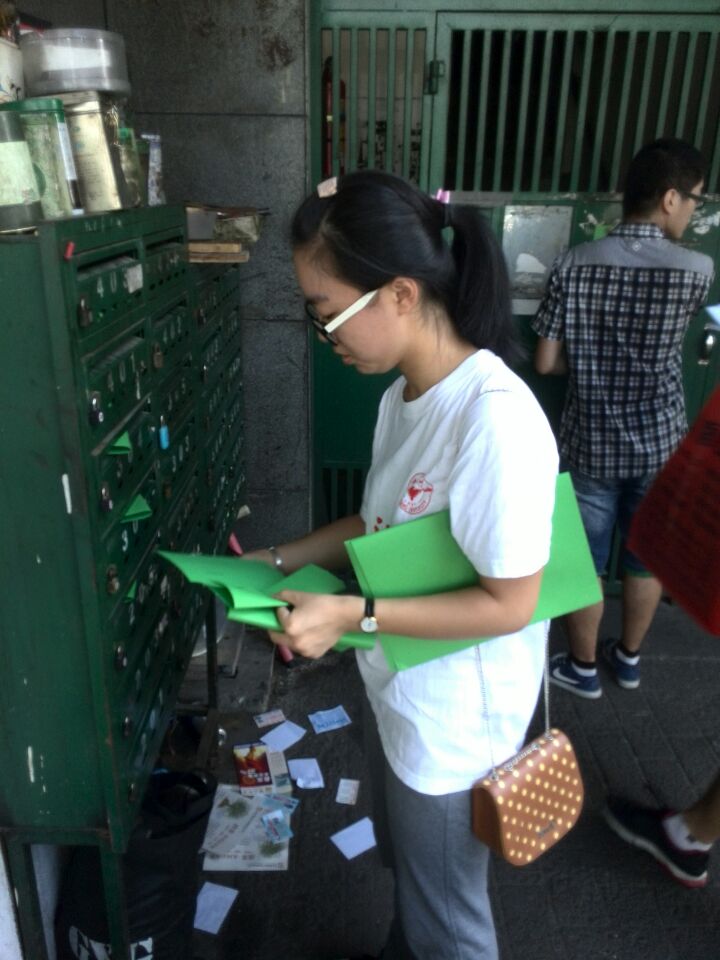 8月1日,小分队的成员们起的早早的,心中也满怀着对社区挂职的期待,在这样的心情下,他们来到了松木场社区,社区副书记张静姐姐接待了队员们,发给队员们一叠厚厚的宣传单,在经过了一番沟通后,实践队员知道了自己的任务,就是把手中的宣传单发送到全社区170个单元门口,2400多户人家的信箱中。听到这个消息,小分队的队员们的心都拔凉拔凉的,他们心中都想着就3个人一天怎么可能完的成。当时似乎是看到队员的心思有些冷淡,队长站了出来鼓励大家:不管难度有多大,既然来了,那就要好好去做。而且因为还只是第一天开始,小分队成员们的心中也都有一股火,于是实践队员们拿着宣传单就出发了。