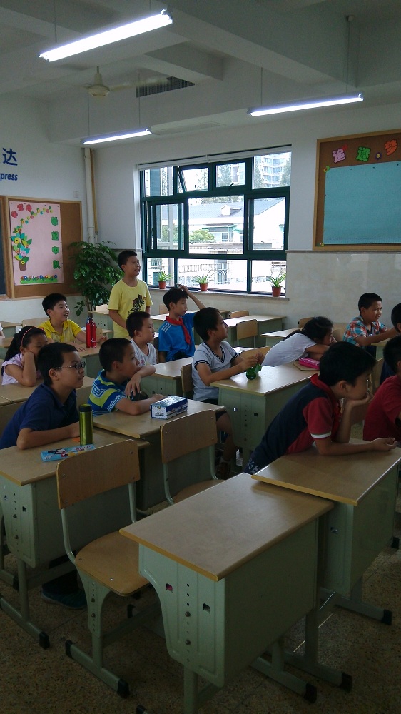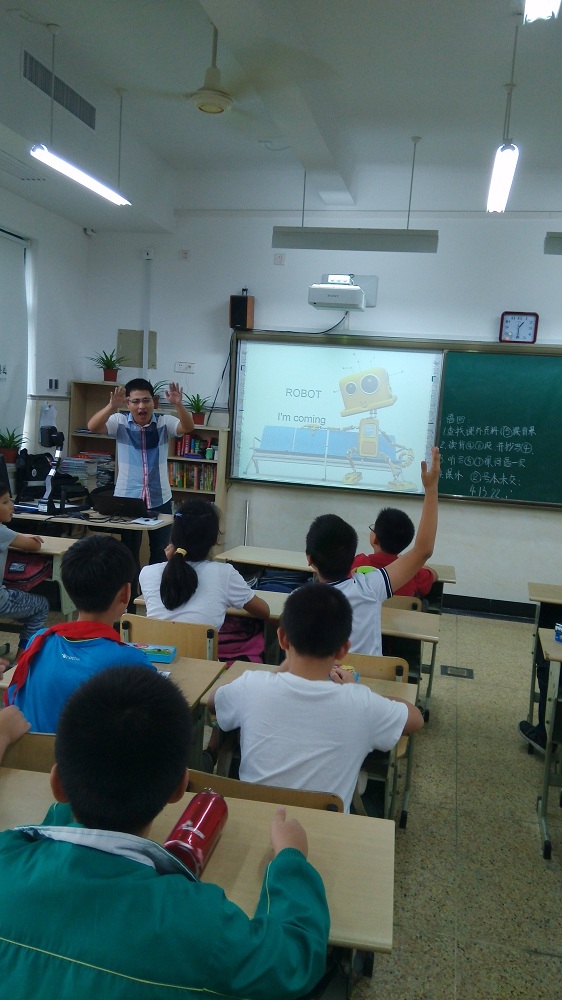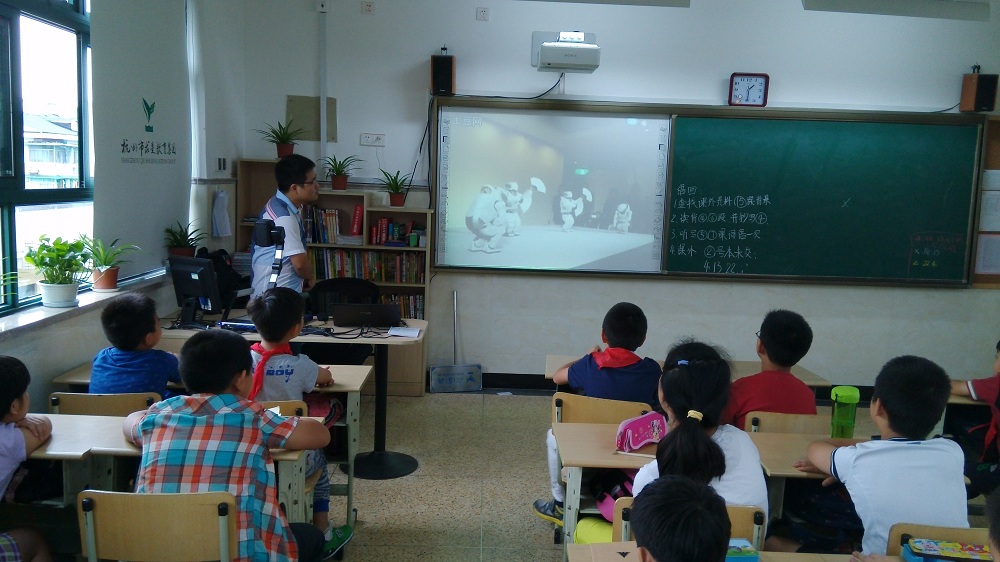 留云同学在本次课程中采用了ppt动画和部分机器人视频相结合的形势来给孩子们上课,他主讲的机器人是他擅长的方面——仿人形机器人。在刚上课时,他就向学生提出两个问题“什么是机器人”、“机器人能用来做什么”引发孩子们的思考,并希望他们在接下来的课程中学习到更多知识。之后他介绍了他们实验室主要做的机器人——足球机器人,这也是浙江大学一个非常优秀的项目,曾经拿过世界冠军。并向孩子们展示了足球机器人的部分视频,孩子们在视频中也频频向留云老师提问这些机器人的一些优缺点,一些孩子也确实提出了一些独到的认识,还提到了麻省理工的机器手之类的,惊了老师一大跳。