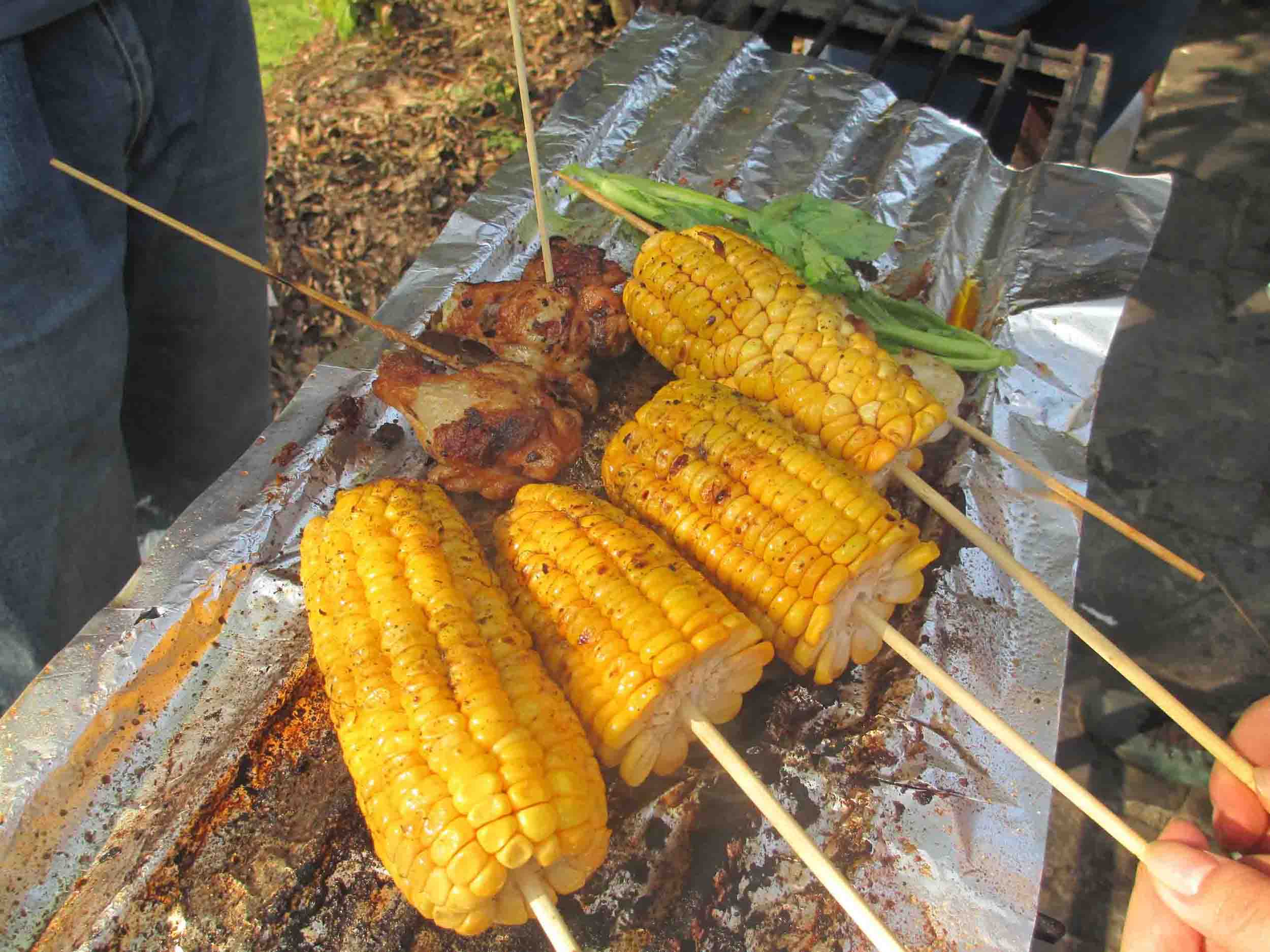 树叶间的阳光慢慢西转,烤架上的烧烤慢慢更替,盘子里的食材慢慢减少,户外烧烤却渐入佳境。几根难熟的玉米是同学们最后的盛宴,玩桌游的同学们也都站起了身,大家都在思考这该如何把它们最大限度地利用。涂传连同学最有方法,他把玉米用锡纸仔细包好,放进炉子的煤炭堆内,做成儿时的烤玉米给大家分享,获得了大家一致的称赞。