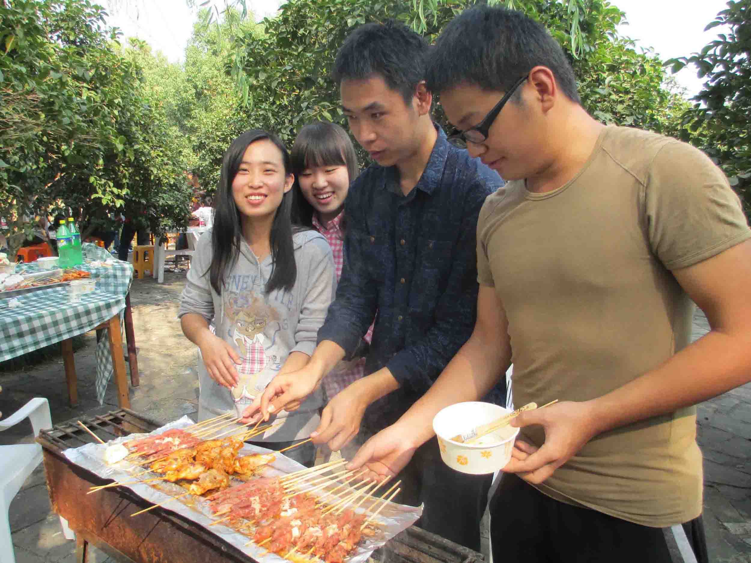 下了公交车,还有很长的一段路要走,不过同学们个个都精神饱满,有说有笑,仿佛把长长的路都缩短了。到达目的地后,经过简单的准备,户外烧烤便正式拉开了帷幕。李明阳同学曾有过几次户外烧烤的经历,自告奋勇地承担起了“首席厨师”的大任。生火,铺纸,涂油,动作熟练而利落。几位同学将食物穿成串,几位同学在烤架旁边帮忙,其他同学围坐在圆桌边聊着天玩着桌游。烤肉诱人的嗞嗞声,同学们爽朗的谈笑声,在风里一齐荡漾着。静静的水塘边,顿时热闹了起来。不久,第一把烤肉出炉了,看着同学们大快朵颐的样子,“大厨”和小伙伴们露出了欣慰的笑容。