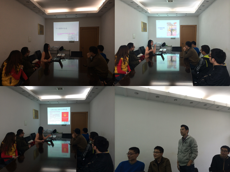 会议由团支书陈媛同学主持,讨论学习所使用的PPT是去年为同学们做主题演讲的崔正哲同学制作的。PPT延用图文并茂的丰富形式,以大量的新闻纪录、数据图表为支撑,生动的引领我们讨论学习四中全会依法治国的指导思路。