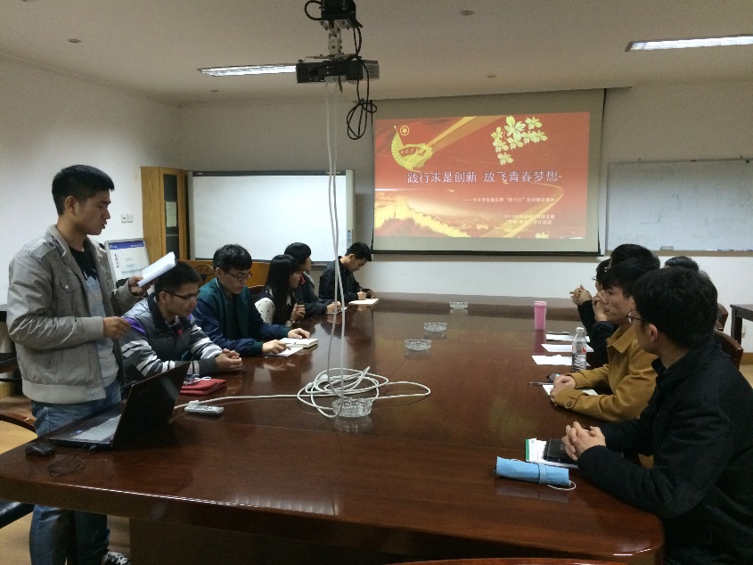 首先,团支书王喆向大家简单介绍了李克强总理“浙大行”的基本情况并转述了总理关于浙大校训的理解。总理对浙大校训和精神有着极为深刻的理解:“求是”是对中国古典文化的继承,既是格物致知、寻求并坚持真理,又强调个人的品行修养与历练;“创新”则是现今时代发展的需要,是国家和民族事业兴旺发达的推动力量。