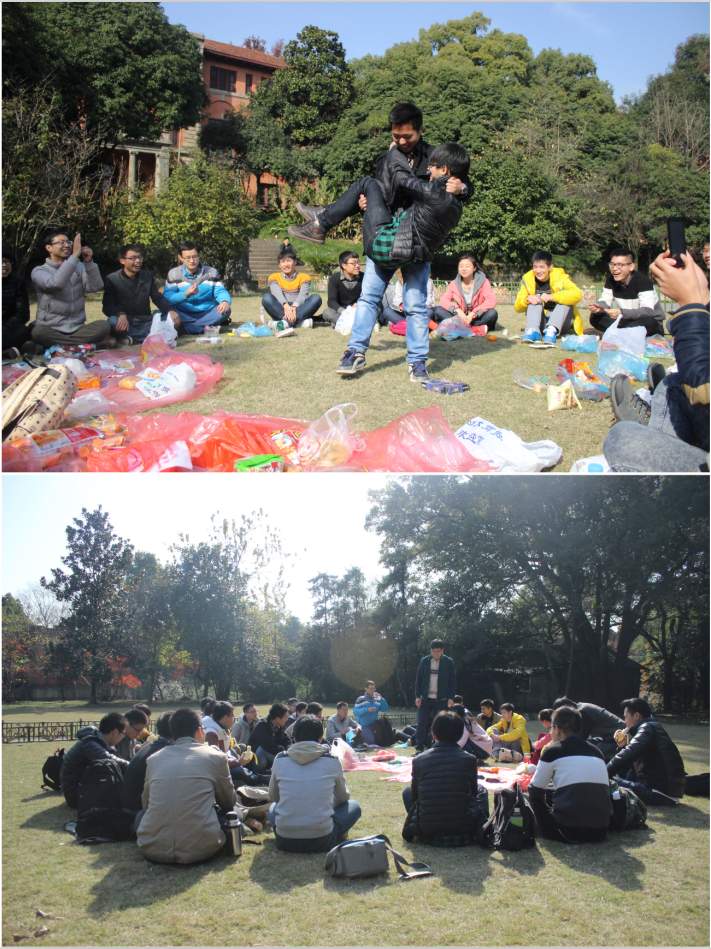 快到中午,我们就起身去往我们的第二站——之江校区。我们穿过校园在主楼前的大草坪席地而坐,拿出了早就准备好的食物,早就饿的肚子咕咕叫的同学们敞开肚皮一阵饕餮。同学们一边吃着,一边玩着各种互动游戏,有真心话大冒险、你比我猜、纸牌等等丰富的游戏。整个过程非常愉快,大家相互沟通,彼此的感情和认识又加深了一层。