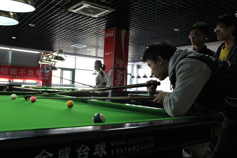 2014年12月6日上午9:00-11:00,由机械工程学院主办,机械工程学院团学联承办的机械工程学院第六届体育联赛紫金港赛区台球赛在紫金港北街阿兵台球馆正式拉开了帷幕。这次比赛的参赛群体由机械工程学院13级和14级机能本科生组成,经过3小时的激烈比赛,最终王炜焕、张鑫、孟宪志三位同学分别夺得前三名。
