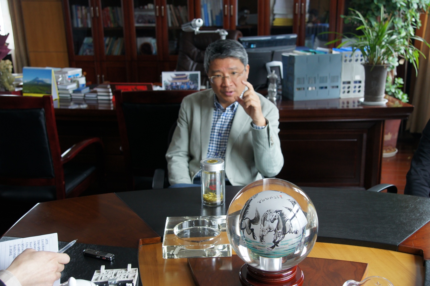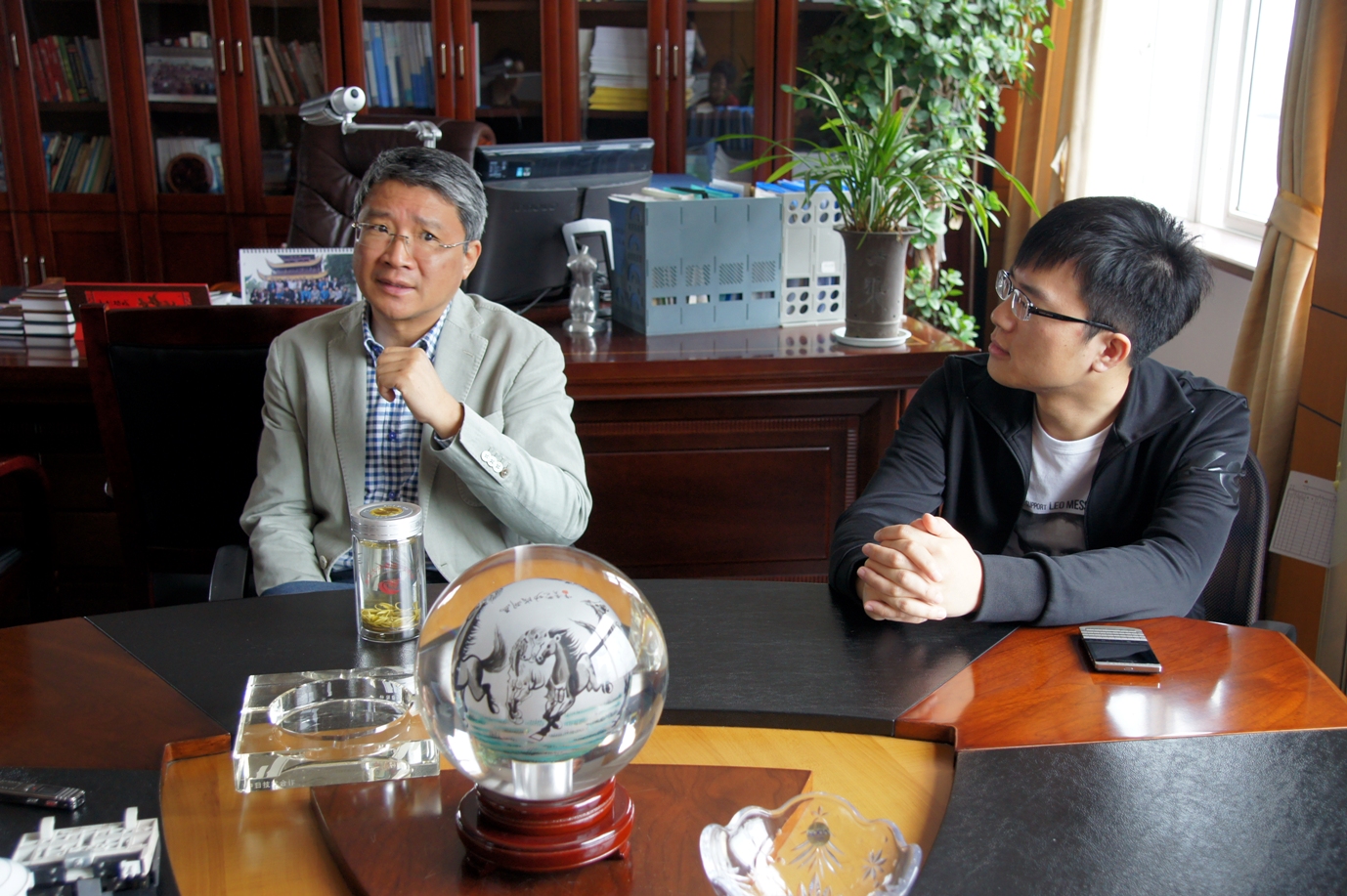 翁振涛先生的办公室宽敞明亮。有书,不多,也并不刻意堆砌。书橱里除了文件,更多的则是液压专业和公司管理之类的书籍。室内除了办公桌、沙发等必备用具外,并没有什么特别的摆设。最引人注目的要数挂在房间正中窗户两侧的两张合影,进门一眼就能瞧见,其中一张就是翁先生早年和浙大机械系凌俊杰教授一起工作的场景。我们就是在这里拜会了翁先生本人。翁振涛先生气质儒雅,和蔼可亲,着装大方朴素,头发略显花白,更像是有学者风范的教授。甫一见面,翁先生几句话就显出平易近人之感,很快就消除了众人的拘谨。寒暄过后,我们从翁先生的求学生涯开始聊了起来。