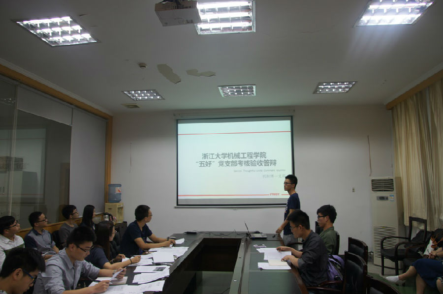 2015年5月14日下午1:30,机械工程学院第六批“五好”党支部验收答辩在玉泉校区教1-103会议室举行。机械工程学院学生党总支副书记、团委书记项淑芳老师、团委副书记霍柄昆老师和各学生党支部书记、支部委员参加了会议。师生党员代表共同组成评议组,参加验收答辩的支部进行PPT展示并回答评委提问。验收答辩会由机械学院学生党员素质发展中心主任郭长春主持。