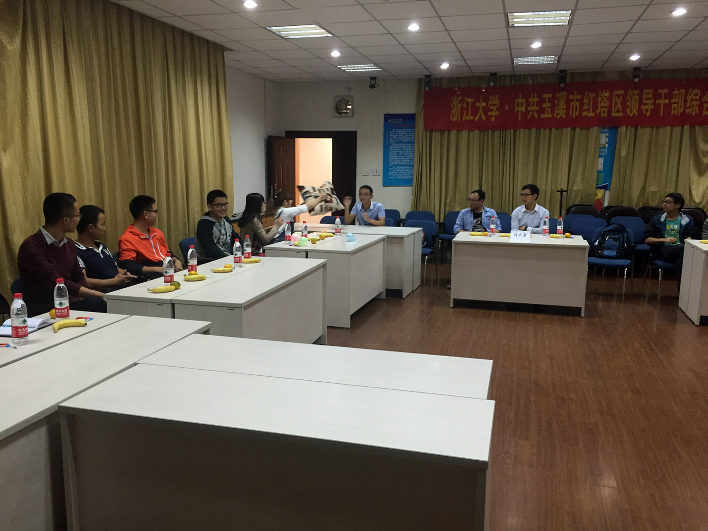 “接下来是游戏环节,一大波福利等你们来拿。下面我们开始‘左邻右友’游戏,采用击鼓传花的方式在你们中选出10名代表参加游戏,听我口令,开始。”主持人话音刚落,作为道具的抱枕开始在空中跳跃,一时间抱枕成了烫手的山芋,谁也不肯在手中多留。“停!”随着主持人的一声令下,张同学在大家的哄笑中成为了第一个代表。随着游戏的持续,大家的花招也多起来,有的同学开始“坑”邻座的同学,在主持人倒数时,拿到抱枕的同学迟迟不出手,在最后一秒将抱枕丢给邻座同学,这一举动点燃了全场的笑点,教室里充满了欢声笑语。十名代表选完后,主持人公布规则,10人围成圈按顺时针方向说出邻友的名字及所属部门,答对者获奖。由于已有基础,该10人顺利完成任务,全体获得了实用的零食小奖品。