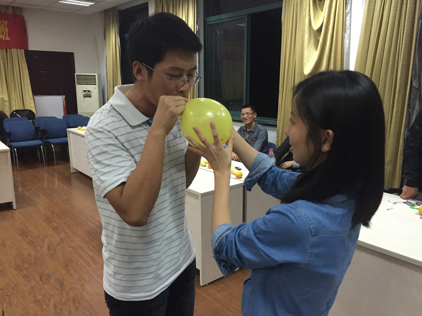 “用手扶着”“你的手拿开”“快把他抱起来”,现场气氛紧张,空气中是气球破碎谱出的旋律。大家不绝于耳的笑声是“笨手笨脚”游戏的高潮,游戏区的五人,有人扮演手的角色,有人扮演嘴的角色,有人扮演屁股的角色,他们要做的是在规定的时间内把气球吹起来坐破,完成个数较多的组获胜,参加的同学按部门成组进行部门“PK”。有的组很有默契,整个过程迅速流畅;有的组经验不足,手忙脚乱,围观的同学们乐的东倒西歪,全场沸腾。