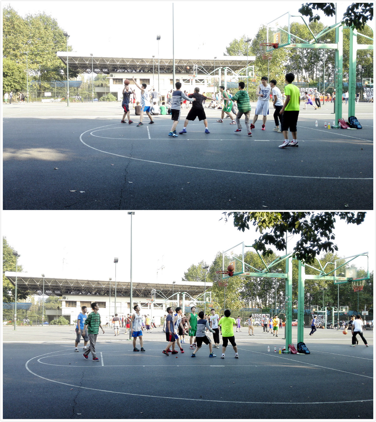 比赛开始,提起篮球赛赛事就兴奋的潘同学开始吹响了裁判的哨子。哨声一响,两队篮球赛队员立马提高了警惕,现场开始有了紧张的气氛。虽然队伍是自发组织的,但是篮球是兄弟间的桥梁,从场上的情况来看,大家配合的十分默契,彼此间一个眼神一个动作,对方就立马会意。由于实力相当,两队你攻我守,场上的比分一直持平,大有不分胜负的趋势。