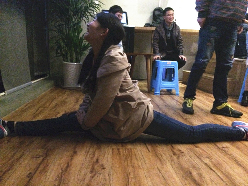 接着进行的是“柔韧度PK”,每个小组选两个人,毫无疑问,身材柔软,号称“胸以下全是腿”的众垚组获得冠军。