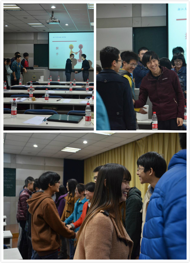 接着闫老师以丰富的案例来引导同学们如何从学会自我介绍,大方讲话,主动表达善意,带着感情讲话,经常夸奖别人等十个方面来掌握沟通艺术。随后闫老师介绍了在几个可能遇到的场景下的沟通方式,并以握手为例进行了现场演示。同学间的握手活动也掀起了全场的高潮,大家不仅学到了正确握手的方式也增进了彼此的感情。
