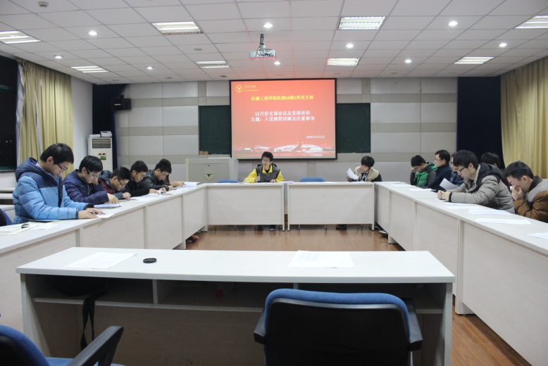 为做到全心全意向相关入党积极分子和预备党员提供最优质的服务,将党支部的运行安排地有条不紊,12月2日晚7时,机制15硕1班党支部的成员不顾天气严寒,齐聚教三406开展了一个以党员相关责任说明及支部工作安排为主要内容的支部会议及党课培训活动。机制15硕1班党支部副书记饶成晨担任支持人,作主要发言。