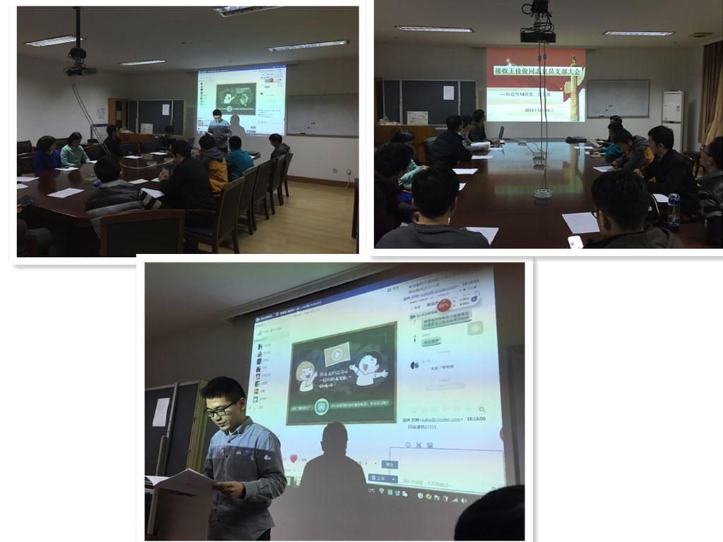 大会严格按照入党流程来,在卢伟江宣布报告出席情况以后,王佳俊同学就入党动机、对党的认识,以及成为入党积极分子以来所做的一些努力。紧接着卢伟江、翁微军作为介绍人宣读了介绍意见,党内的各位党员也对王佳俊同学进行讨论、民主发言。王佳俊也就党员提出的意见谈谈自己的看法。最后大会进行无记名投票表决,由于部分党员在外出差,党支部采取视频会议的方式让各位党员充分参与,最终参与大会的党员一致同意王佳俊同学加入中国共产党。