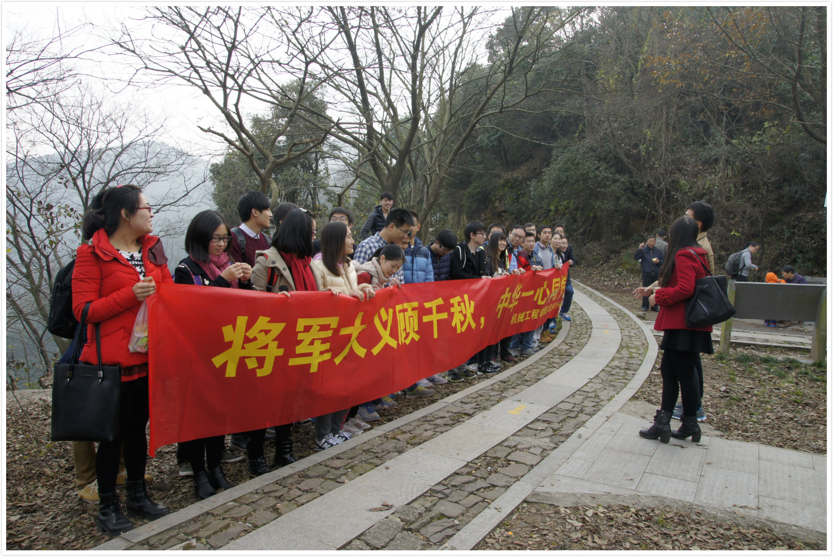 2015年12月12日下午1时,机械学院机制15硕1班联合马克思主义学院若干同学共30人齐聚浙江杭州法喜寺正门,开始了纪念“双十二”西安事变的毅行活动。同学们从法喜寺出发经历过上山下山,锻炼自己坚韧不拔之志,增强自身体魄以担当重任,不辱使命。