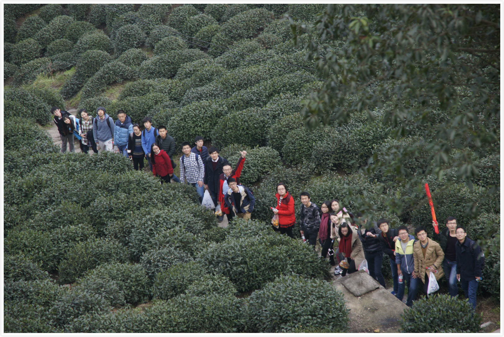 “下山容易上山难,赚的行人空喜欢”,对此代同学深有体会:“我觉得下山比上山难受,阶梯太陡,步伐太快,双腿较上山时更疲乏。”下山的小路隐藏在漫山遍野的茶树中,茶花的美丽引得大家不觉驻足,清新的空气也获得了大家的一致好评。尽管双腿酸乏,整支队伍还是有序的向前行进着,途中有些同学实在累了,也有其他同学搀扶,毅行坚韧的氛围笼罩在每个人心中。