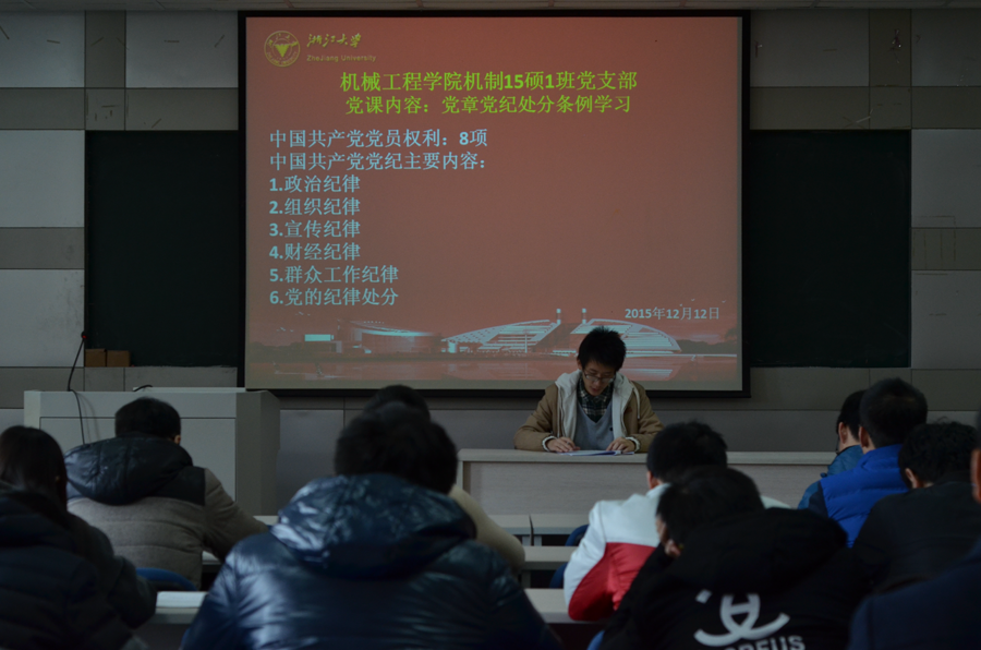 12月12日,机制15硕1班党支部在教3-406室召开支部会议,参加此次会议的有机制15硕1班党支部党员和预备党员,党支部副书记饶成晨。会议由党支部副书记饶成晨主持,对陈上钻预备党员发展为中共正式党员进行了讨论和表决,并主持展开党章党纪处分条例的学习。