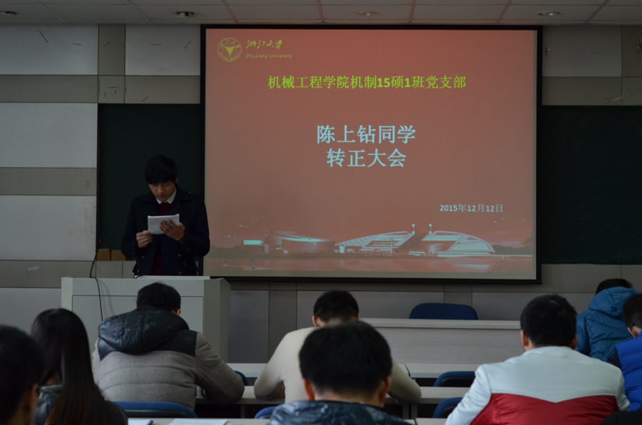 预备党员转正大会上,陈上钻同志对其预备期一年内的工作、学习、思想等方面进行自我总结汇报,详细阐述其在预备期内在学习、班级工作和社会志愿工作方面所起到的党员带头模范作用,获得了台下所有党员同志的一致肯定。