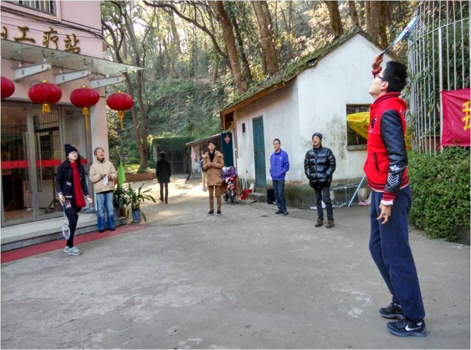 随后,小队兵分两路。林杰同学前往楼上的计算机房,帮助冯益明老先生学习使用电子邮箱的收发功能。老先生对新鲜事物特别好奇,为了不忘记操作过程,非常认真地在纸上记录每一个步骤,并反复尝试,直至完全熟悉为止。听罗大姐介绍,老先生是新中国第一批大学生,虽然中间历经了一些挫折,但至今仍保持着对强烈的求知欲,这一精神着实令人感动。其余同学则在工疗站前陪工友们进行踢毽子、打羽毛球等体育活动,气氛轻松欢乐。上午的活动临近尾声,志愿者们和工疗员们一同进行了简单而美味的午餐。