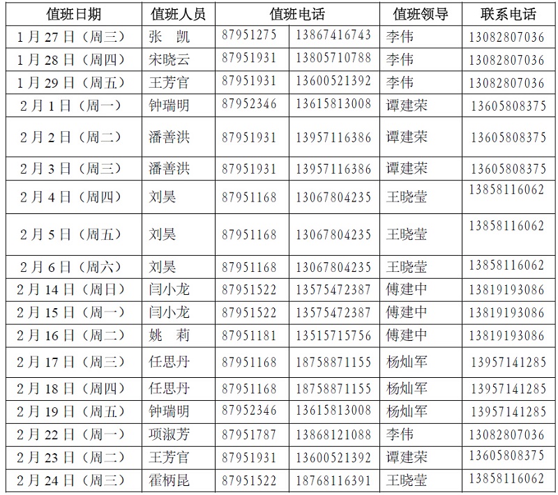 注:1. 值班时间:上午:8:30—11:30,下午:1:30—4:30;2. 值班地点:第一教学大楼机关科室岗位;3. 值班人员要坚守岗位,认真做好记录,主动了解学院情况,做好防火防盗工作; 4. 如遇事或紧急情况,请立即向校区(校区值班电话:87951661)汇报并通知有关部门。